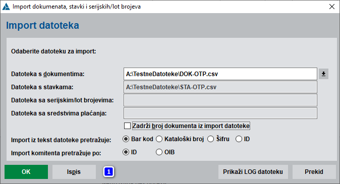 Import dokumenata, stavki i serijskih brojeva radi se na sljedeći način: Na tabeli, u ovom primjeru otpremnica, pozovite Dokument --> Import dokumenata, stavki i serijskih brojeva iz tekst datoteke (prikazano na slici ispod):