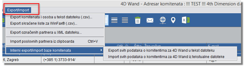 S tabele koja se otvorila, pozivom izbornika Exprot/Import, otvara se mogućnost izbora jedne od sljedećih opcija exporta: Export komitenata i osoba u tekst datoteku (csv), Export skraćene liste za WinFax (csv), i Export označenih komitenata u xml datoteku.