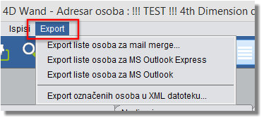 Nakon što se otvori tabela osoba pozivom izbornika Export/Import omogućava se izbor jedne od sljedećih opcija: Export liste osoba za mail merge, Export liste osoba za MS Outlook Express ili Export liste osoba za MS Outlook.