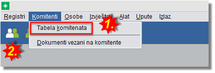 Exportira se po jedna datoteka (csv ili txt) za Osobe, u ovisnosti o odabranom exportu. Predloženi naziv izlazne datoteke ima oblik *.csv Npr: Osobe.csv. Nije nužno da datoteke imaju ovakav naziv. Export datoteka osoba radi se na sljedeći način: U modulu Adresar, pozivom opcije izbornika Osobe --> Tabela osoba (1.) ili klikom na ikonicu (2.), otvora se tabela komitenata.