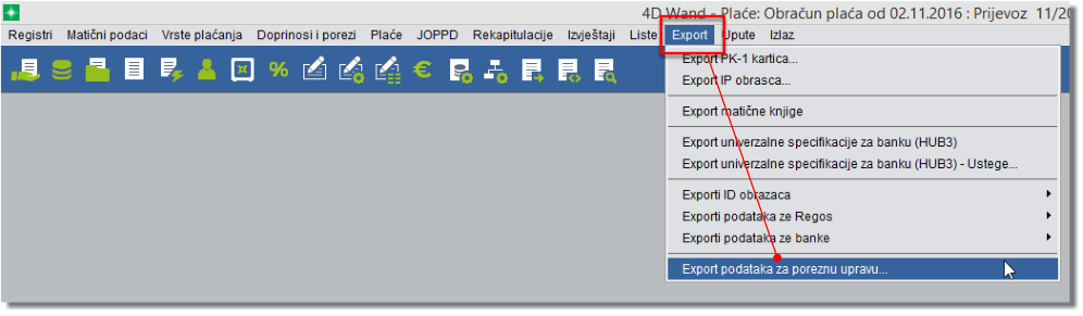 U modulu Plaće odabrati opciju Export -> Export podataka za poreznu upravu...