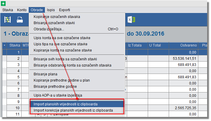 U MS Excel-u ili nekom drugom programu pripremite set podatka prema gore navedenoj tablici, označite kompletan set podataka, te korištenjem naredbe copy (ctrl+c) kopirajte podatke u clipboard. U modulu FAP odaberite željeni financijski izvještaj, te uđite u njegove stavke. Na tabeli stavaka izvještaja aktivirajte izbornik Akcije te prema potrebi odaberite opciju Import planskih vrijednosti iz clipboarda ili Import korekcije planskih vrijednosti iz clipboarda