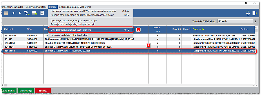 •U prozoru web klasifikacije s desne strane ekrana artikla pojavila se nova kolona „Prioritet“. Ako ne vidite ovu kolonu, potrebno je resetirati format tablice (desni klik na zaglavlje tablice i odaberite opciju za resetiranje formata). Kolonu možete pomicati na standardni način. 1. Postavljanje prioriteta na artikle: •Označite artikl(1) ili artikle na koje želite upisati prioritet pozovite padajući izbornih „Obrade“ --> „Upis prioriteta za slog/označene slogove“(Alt+G) (2).
