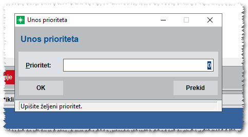 •U novo otvorenom prozoru „Unos prioriteta“ unesite brojčanu vrijednost prioriteta i potvrdite s tipkom „OK“.