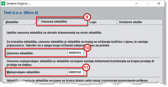 Napominjemo da u slučaju rada s tranzitnim skladištem svakako na kartici „Osnovna skladišta“ (9) popuniti sljedeće podatke - U „Osnovno skladište“ (10) upisati šifru skladišta na kojem se nalazi zaliha i s kojeg će se zaliha automatski skidati, te u polje „Maloprodajno skladište“ (11) upisati šifru maloprodajnog skladišta.