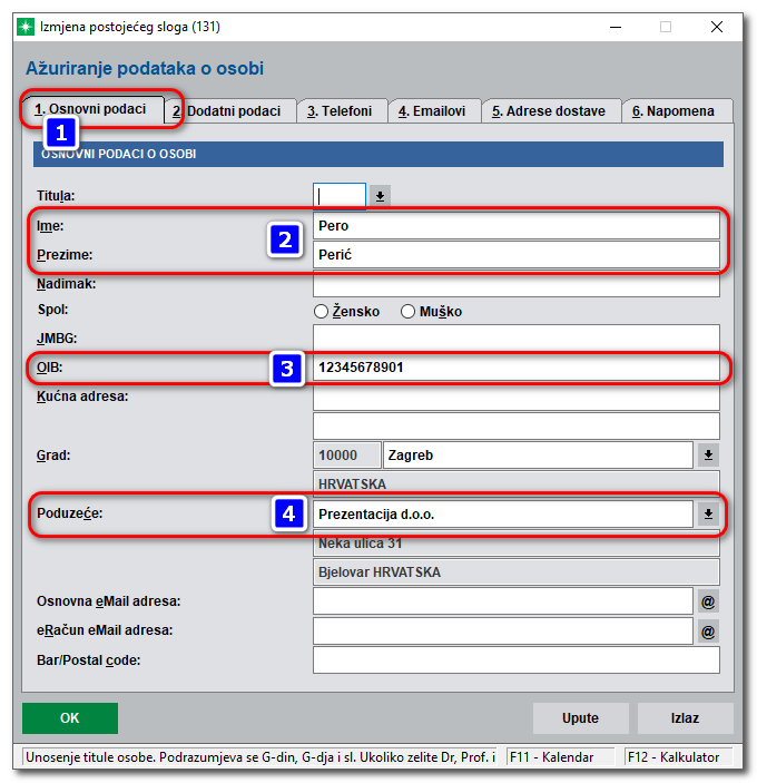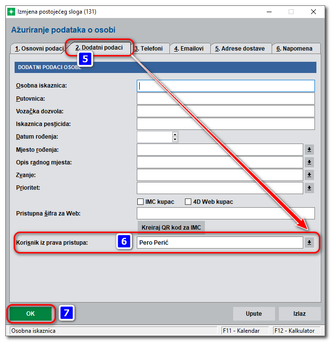 Na kartici „2. Dodatni podaci“ (5) nužno je vezati osobu za korisnika iz prava pristupa (6). Korisnik iz prava pristupa predstavlja korisničko ime koje se upisuje prilikom prijave operatera u 4D Wand.