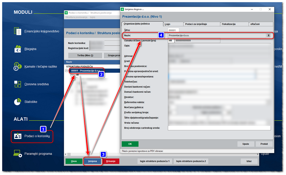 Ako niste sigurni koji partner iz adresara predstavlja Vašu tvrtku (4. oznaka s prve slike), isto možete provjeriti u podacima o korisniku s početnog ekrana 4D Wand-a: Podaci o korisniku (1), kliknite na naziv tvrtke (2) te na „Izmjena“ (3) i provjerite partnera iz adresara koji je povezan za organizacijsku jedinicu (4),