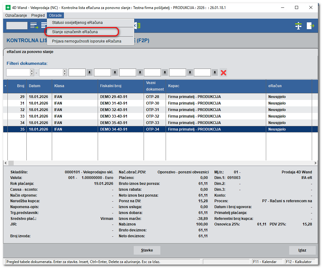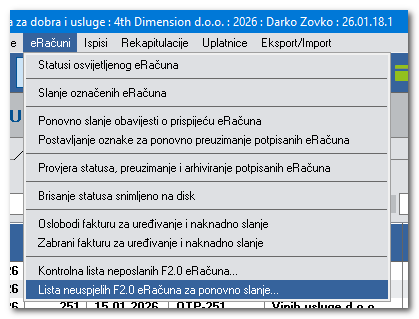 Za pretpostaviti je da će svi eRačuni uspješno otići ka primatelju, pod uvjetom da se početni problem riješio sam od sebe (na primjer, informacijski posrednik je bio nedostupan, pa je u međuvremenu postao dostupan). U biti, ukoliko svi uredno rade svoj posao, tabela bi se neupitno trebala isprazniti i nitko više ne bi trebao imati nikakvih problema. Ali, očito da nije tako u praksi. Uzmimo za primjer da ćete u tabeli zateći 20 eRačuna. Možete ih ponovo poslati jednog po jednog, možete označiti nekoliko njih (isfiltrirati jednog istog kupca, na primjer) ili poslati ponovo sve račune odjednom. Najvjerojatnije će tabela ostati prazna. Ali isto ne znači da će svih 20 eRačuna zaista proći do primatelja bez problema. Ukoliko od 20 eRačuna, napokon bez problema može proći njih 16, to će se zaista i odigrati. Ali, nakon nekog vremena, 4 eRačuna će ponovo dobiti status "Neuspjelo" i ponovo se naći na ovoj tabeli. Na Vama je da probate više puta, pa ako neki eRačuni uporno zapinju, najbolje poslati "papirnati" račun.