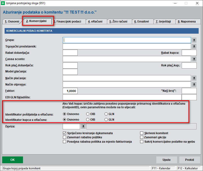Osnovni i dodatni identifikatori Norma za razmjenu eRačuna dozvoljava korištenje dvije razine identifikatora: osnovni i dodatni identifikator za prepoznavanje. Osnovni identifikator je uobičajeno onaj kojim su prodavatelj ili kupac prijavljeni u AMS, a dodatni identifikator dodaje mogućnost korištenja nekog drugog identifikatora u dogovoru pošiljatelja i primatelja. Na primjer, veletrgovac je u AMS za razmjenu eRačuna prijavio svoj OIB, želi da mu primarno pošaljete svoj primarni identifikator koji ste prijavili u AMS, ali isto tako želi da mu dostavite svoj GLN broj i pošaljete mu robu na neku određenu lokaciju za koju ima poseban GLN broj. Naime, GLN broj (Global Location Number) broj je međunarodno jedinstveni 13-znamenkasti broj koji služi za preciznu identifikaciju pravnih subjekata, lokacija (fizičkih ili digitalnih) i funkcionalnih jedinica u lancu opskrbe. Zašto uz OIB i GLN Osnovno? Adresiranje poslovnih subjekata u razmjeni eRačuna prije nastupanja Fiskalizacije 2.0 radilo je tako da je kao primarni identifikator eRačuna primatelja i pošiljatelja uvijek preferencijalno popunjavan OIB, a dodatni identifikatori, ako su bili upisani, bili su poslani u dodatnom identifikatoru. Jedini izuzetak je bio u slučaju da je u adresaru i u podacima primatelja i u podacima pošiljatelja, odnosno, komitenta koji je zakačen za organizacijsku jedinicu u podacima o poduzeću, bio naveden GLN broj. U tom slučaju su se u XML kao primarni identifikatori našli GLN brojevi i za primatelja i za pošiljatelja, a OIB je bio prikazan u dodatnom identifikatoru. •Osnovno: identifikacija koju smo zadržali iz dosadašnjeg načina rada; •OIB: forsira slanje OIB-a kao primarnog identifikatora; •GLN: forsira slanje GLN broja kao primarnog identifikatora. Velika većina korisnika će nastaviti funkcionirati kao i do sada bez potrebe upravljanja ovim opcijama, dok će oni koji posluju s veletrgovinama, u dogovoru s njima podesiti ove parametre na odgovarajući način . Napominjemo da veletrgovine većinom imaju GLN brojeve za svoja mjesta isporuke, a ako inzistiraju na tome da se za mjesto otpreme pošalje različit primarni identifikator od onoga na krovnom komitentu, potrebno je sukladno tome na poslovnici veletrgovine izmijeniti parametar Identifikator kupca u eRačunu.
