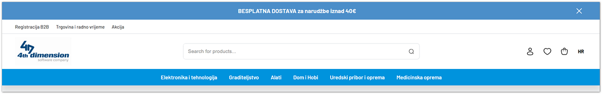 5 VARIJANTI ZAGLAVLJA (HEADER), 3 VARIJANTE PODNOŽJA (FOOTER) I TU NIJE KRAJ! Svaka web trgovina ima dva elementa koja posjetitelj primijeti odmah pri dolasku: zaglavlje i podnožje. Upravo ta dva elementa nose vaš vizualni identitet, olakšavaju navigaciju i oslikavaju prvi dojam. U 4D Web Shopu ta dva elementa možete potpuno prilagoditi (izgled, boje, sadržaj i logotip) putem dodatka 4D Web -> Izgled . Zaglavlje (header) 4D Web Shop trenutno nudi 5 varijanti zaglavlja razvijenih kako bi odgovorile na stvarne potrebe naših korisnika, od onih s opsežnim kategorijama proizvoda do onih koji preferiraju čist i elegantan pristup. Kratki pregled varijanti: Zaglavlje 1 - klasičan i provjereni izgled, dobar polazišni odabir za većinu trgovina