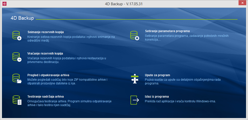 Backup 4D je program za arhiviranje podataka, program kojim sigurno arhivirate bilo koju skupinu (set) podataka iz vašeg računala. Program omogućava kompresiju u proširenom i svima dostupnom PKZip formatu, testiranje, pregled i dearhiviranje željenih podataka. Arhivirati možete podatke na više destinacija odjednom i to bilo gdje: u bilo koji direktorij računala, na bilo koji disk računala ili računalne mreže, kao i na bilo koji prijenosni USB disk.
