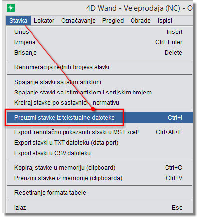 Koristeći tako kreiranu tekstualnu datoteku, punjenje primke ili nekog drugog dokumenta tim stavkama, predstavlja izuzetno jednostavan i ujedno kontroliran i pouzdan proces. Import stavki dokumenta (data port) U padajućem izborniku Stavka u stavkama primke pozovite funkciju Preuzmi stavke iz tekstualne datoteke: