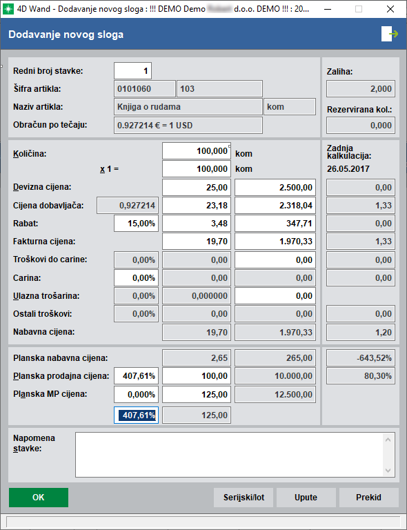 Redni broj - popunjava se automatski u rastućem nizu. Moguće ga je izmijeniti ručno ili procesom renumeracije pozivom odgovarajuće ikone na tabeli stavki. Iza njega se automatski popunjavaju polja sa šifrom artikla kao i polje s kataloškim brojem odabranog artikla. Naziv artikla - prikazuje naziv artikla i popunjava se automatski odabirom artikla. Cijena na skl.(adištu) - u tom polju se prikazuje cijena robe s robne kartice. Za skladište nabavnog tipa u tom polju se prikazuje trenutna prosječna nabavna cijena tog artikla na odabranom skladištu. Za skladište maloprodajnog tipa prikazuje se zadužena maloprodajna cijena (nabavna cijena + marža + PDV) tog artikla na odabranom skladištu. Za skladište veleprodajnog tipa prikazuje se zadužena veleprodajna cijena (nabavna vrijednost + marža) tog artikla na odabranom skladištu. Zaliha - prikazana je trenutna zaliha tog artikla na odabranom skladištu. Zad.(nja) nab.(avna) cij.(ena) - prikazana je zadnja nabavna cijena odabranog artikla (sa zadnje primke). Rezerv.(irano) - prikazana je ukupno rezervirana količina odabranog artikla na odabranom skladištu. Grupa stavki - više o grupama stavki možete pročitati na ovoj poveznici. Količina - u polje se unosi količina odabrane stavke. U direktnoj je vezi s poljem x 1,0000 (količina u drugoj jedinice mjere), odnosno njihovim prethodno definiranim međuodnosom (1,000 predstavlja faktor s kojime se količina u osnovnoj jedinici mjere množi da bi se izračunala količina u drugoj jedinici mjere). Moguće je unijeti jedan ili drugi podatak (npr. 1 paket pločica ili npr. 1,4 m2 preko druge jedinice mjere). Devizna i osnovna cij.(ena) po pl.(anskoj) kalk.(ulaciji) - u ovim poljima prikazuju se planirane prodajne cijene u valuti u kojoj se vodi artikl u planskoj kalkulaciji (u primjeru je € a može biti bilo koja druga valuta (dolar, funta, švedska kruna...) te potom planirana prodajna eurska cijena definirana u planskoj kalkulaciji. Prikazani tečaj govori na bazi kojeg tečaja je izračunana planirana prodajna cijena u euru. Bruto veleprodajna cijena u dev.(izi) - u prvom polju je prikazana valuta i tečaj s dokumenta, u drugom polju prodajna cijena u devizi s dokumenta, u trećem polju ukupan prodajni iznos u devizi s dokumenta. Ako se skladište vodi po planskim cijenama program će ponuditi planiranu prodajnu cijenu iz planske kalkulacije, odnosno rabatne politike ako je u rabatnoj politici zadano drukčije. U slučaju da se radi o maloprodaji koja se vodi po planskim cijenama, ponudit će se cijena iz planske kalkulacije. Ako se maloprodaja ne vodi po planskim cijenama, ponudit će se prodajna cijena zadužena na skladištu. Ako nije ništa definirano ne nudi se nikakva cijena. Bruto veleprodajna cijena - u ovom polju iskazuje se uvijek cijena u valuti koja je definirana za tu tvrtku. Maksimalni rabata / Rabat - prikaz maksimalnog rabata za odabrani artikal kojeg možete dati komitentu za kojeg radite dokument a da marža ne bude negativna. Sljedeće polje omogućava upis željenog rabata. Više o rabatima pročitajte na ovoj poveznici. Netto veleprodajna cijena u dev(izi): - prikaz prodajne cijena nakon obračunatog rabata prikazano u devizi sa zaglavlja dokumenta. Prvo polje jedinična netto veleprodajna cijena za količinu 1. Drugo polje ukupna netto cijena za ukupnu količinu. Netto veleprodajna cijena: - u ovom polju izračunata je prodajna cijena nakon obračunatog rabata u eurima. Prvo jedinična za količinu 1, potom za ukupnu količinu u sljedećem polju. Poseban porez (trošarina) - prikaz postotka i iznosa posebnih poreza ako se isti obračunavaju na dotičnoj robi. Porez na dodadanu vrijednost - na formi se automatski popunjavaju porezna tarifa i njena stopa te izračuni pdv-a na osnovu njih. Porezna olakšica - prikaz porezne olakšice vozilu u slučaju da se radi o vozilu i da je upisana na vozilu. Povratna naknada - prikaz povratna naknade u slučaju da se obračunava na artiklu. Posebni porez na motorna vozila - prikaz porezan na motorna vozila u slučaju da se radi o vozilu i da se obračunava na vozilu. Cijena s porezom - prikaz izračune cijene s obračunatim porezom. Marža prije rabata - prikaz marže u slučaju da na dokumentu i na stavkama nije dan nikakav rabat. Marža - ostvarena marža, razlika u cijeni od nabavne do prodajne cijene. Nabavna cijena -u prvom polju iskazana je planirana nabavna cijena iz planske kalkulacije. U drugom polju jedinična prosječna nabavna cijena. U trećem polju ukupan nabavni iznos za cijelu količinu. Napomena kupca - u ovom polju se prikazuje napomena za kupca za kojeg se unosi stavka. Ista se ne ispisuje na dokumentu koji kreirate. Napomena stavke - ako unesete određenu napomenu u ovo polje ista se ispisuje na dokumentu ako pozovete taku vrstu ispisa (npr. Veleprodaja --> Otpremnice --> Ispis --> Otpremnica s opisom artikla). Serijski/lot - Ako vodite serijske i/ili lot brojeve pozivom ove tipke otvara se forma za unos serijskog/lot broja.