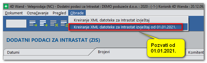 Nakon poziva procesa otvara se forma s upitom na kojoj je ponuđen sljedeći slobodni redni broj dokumenta Dodatni podaci za Intrastat i datum kreiranja dokumenta. Polje Datum dokumenta može se mijenjati. Pritiskom na OK proces provjerava da li je za izvorni dokument već ranije kreiran dokument Dodatni podaci za Intrastat i ako jest, daje u poruci obavijest o takvoj situaciji i prekida kreiranje novog dokumenta. Tako kreiran dokument Dodatni podaci za Intrastat je nakon kreiranja povezan u stablo dokumenata i moguće ga je vidjeti i skočiti na njega koristeći funkciju 'Ctrl+S' pregleda i praćenja stabla dokumenata. Prilikom kreiranja dokumenta Dodatni podaci za Intrastat, proces uzima u obzir osnovne podatke postavljene u Parametri programa --> Setiranje dokumenata --> Intrastat odvojeno za primitke, odvojeno za izdatke, tako da postavljanjem najčešćih opcija za jednu i drugu vrstu prometa, možete bitno skratiti vrijeme pripreme podataka, jer će se već prilikom kreiranja dokumenta na njemu upisati osnovne postavke, čime se izbjegavaju dodatni upiti i potreba za ažuriranjem svih dodatnih podataka na kreiranim dokumentima. U svakom slučaju, nakon samog kreiranja dokumenta s dodatnim podacima za IntraStat, nužno je pregledati kreirani dokument i po potrebi izmijeniti one vrijednosti koje nisu odgovarajuće za događaj iz kog je dokument kreiran. U padajućem izborniku Obrade nalazi se sljedeći proces: Kreiranje .XML datoteke za IntraStat izvještaj U kontekstu europske reforme Intrastatova izvještavanja tijekom 2020. u Republici Hrvatskoj provodi se modernizacija Intrastatova IT sustava Carinske uprave i Državnog zavoda za statistiku te uključuje sljedeće izmjene: •modifikaciju Intrastatova obrasca za otpreme (izdatke): popunjavanje dvaju dodatnih polja (Zemlja podrijetla i PDV ID broj kupca/primatelja robe) •ukidanje polja Statistička vrijednost za oba toka (primitak i izdatak) ***VAŽNO! Ove izmjene primjenjuju se od 1. veljače 2021. dostavom Intrastatovih obrazaca za razdoblje izvještavanja siječanj 2021. nadalje. To znači da se do tada predaju stari obrasci, pa i u situacijama u kojima je potrebno poslati nadomjesni ili korektivni obrazac za neki izvještaj iz razdoblja prije siječnja 2021. Korisni dokument: Promjene u Intrastatovu izvještavanju od 1. siječnja 2021. potražite na poveznici: Kreiranje .XML datoteke za IntraStat izvještaj Podatke za IntraStat je potrebno kreirati najmanje dva puta, jednom za ulazne i jednom za izlazne dokumente. Nakon što ste s primki i izlaznih dokumenata kreirali (Financije --> Nadzorne knjige... --> Dodatni podaci za Intrastat (ZIS)) dokumente, u tabeli dokumenata ZIS pozovite padajući izbornik Obrade i u njemu odaberite proces Kreiranje .XML datoteke za IntraStat izvještaj ili za dokumente iz 2021. Kreiranje XML datoteke za Intrastat izvještaj od 01.01.2021.