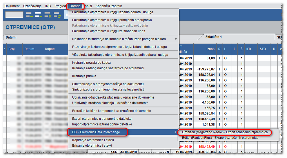 Export izlazne datoteke pokreće se pozivom Veleprodaja NC --> Promet --> i odabirom izborne linije Otpremnice, Potom se poziva procedura odabirom padajućeg izbornika Obrade --> EDI - Electronic Data Interchange --> Omnizon (Megatrend Redok) – Export označenih otpremnica