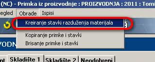 Znači na skladištu proizvodnje imamo informaciju da dvije komode još uvijek nisu proizvedene (rezervirana količina artikla Komoda), ali imamo i informaciju da materijal koji smo u prijašnjim koracima prenjeli sa skladišta repromaterijala (0000101), nije razdužen. Slijedeće što moramo napraviti je da od Primke iz proizvodnje napravimo dokument Razduženje materijala. To ćemo napraviti tako da sa dokumenta Primka iz proizvodnje iz padajućeg izbornika Obrade odaberemo opciju Kreiranje stavki razduženja materijala;