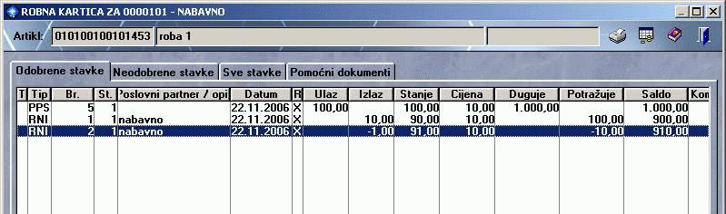 Procesi (Obrade) U padjućem izborniku Obrade, nalaze se standardne obrade za: •Premještanje označenih stavki •Kopiranje označenih stavki •Brisanje označenih stavki U istom izborniku nalazi se i proces za Upisivanje grupe za označene stavke Napomene Kreiranje radnog naloga sastavnice Nakon izbora sastavnice program vrši slijedeće operacije: •Kopiranje stavke sastavnice u konkretnu stavku dokumenta •Ako se sastavnica kreira po planskoj nabavnoj cijeni komponenti, učita i upiše te stavke, •U suprotnom učita stanje skladišta i ako ima stanja učita nabavnu cijenu sa skladišta. Ako stanja nema, učitava plansku nabavnu cijenu komponente, a ako nije upisana učita zadnju cijenu na skladištu dok je bilo robe. Rastavnice Ukoliko se na RNU proizvedena količina stavi u minus, takav radni nalog u biti predstavlja rastavnicu. Dakle, RNU će na skladište gotovih proizvoda donijeti npr. -1 proizvod, a RNI će sa skladišta repromaterijala razdužiti npr. -2 komponente. Na slici je prikazana robna kartica proizvoda koji je jednom prozveden i jednom rastavljen. Na drugoj slici je robna kartica jedne od komponeti.