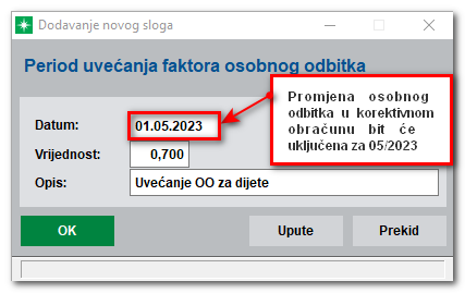Registar poreznih stopa i osnovica trebate popuniti samostalno iz razloga koje smo naveli u 4D Wand Infu 562 - EURO XII - PRELAZIMO NA EURO - Plaće izmjena poreznih osnovica . Promjena osobnih odbitaka tijekom godine Za radnike koji su tijekom godine imali promjenu faktora osobnog odbitka, trebalo je u periodima faktora osobnih odbitaka (kartica broj 4. Obitelj i odbici na samom radniku) upisati periode od kada se primjenjuje novi faktor osobnog odbitka. Radi točnog izračuna godišnjeg osobnog odbitka, kada je u pitanja promjena osobnog odbitka tijekom mjeseca, ako želite primijeniti osobni odbitak i za taj mjesec u godišnjem obračunu, tada u periodima osobnih odbitaka treba upisati da isti vrijedi od prvog dana u tom mjesecu (npr. 01.05.2023.). U protivnom ako ste napisali da osobni odbitak vrijedi od 15.05.2023., kod izračuna godišnjeg osobnog odbitka, program će navedenu promjenu primijeniti od 01.06.2023. godine.
