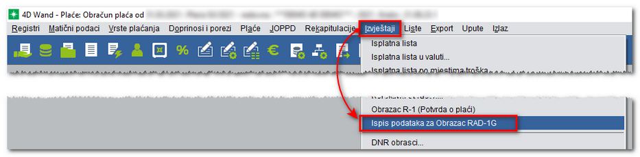 OBRAZAC RAD 1-G U programskom rješenju 4D Wand u modulu Plaće dodana je mogućnost kreiranja podataka za Obrazac RAD-1G – Godišnji izvještaj o zaposlenima i isplaćenoj plaći za ožujak 20XX.(aktualne godine). Obrazac se poziva u padajućem izborniku Izvještaji --> Ispis podataka za Obrazac RAD-1G. Navedeni obrazac kreira se u MS Excelu i nakon toga je potrebno prepisati podatke na web servis Državnog zavoda za statistiku (www.dzs.hr). Naime, sustav predaje RAD-1G obrasca nema mogućnost predaje (učitavanja) obrazaca u xml formatu kao što je to primjerice slučaj s ePoreznom prilikom predaje PDV-a, JOPPD-a i sličnih obrazaca tako da ste podatke s pripremljenog RAD-1G obrasca iz 4D Wanda primorani prepisati na web servis Državnog zavoda za statistiku. Također, ispis RAD-1G obrasca poziva se iz aktualne godine, a potrebno je da u programu imate otvorenu (definiranu) i prethodnu godinu s obračunima plaća za svih 12 mjeseci. Razlog za to je što se na Obrascu RAD-1G trebaju prikazati podaci o isplaćenoj neto i bruto plaći za prethodnu godinu za one radnike koji su radili svih 12 mjeseci u prethodnoj godini. Molimo vas da se detaljno upoznate s dotičnim obrascem i pravilima za popunjavanje istog. Obrazac RAD-1G sastoji se od referentne stranice i ukupno 9 tablica koje potrebno popuniti podacima iz plaća. Obrazac se poziva u padajućem izborniku Izvještaji --> Ispis podataka za Obrazac RAD-1G: