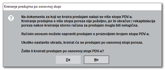 Drugi slučaj kod predujmova gdje smo promijenili dosadašnji način rada radi ispravnog obračuna PDV-a je situacija kada na ponudi iz koje kreirate račun za predujam imate artikle s više različitih stopa PDV-a (npr. 25% i 5%, ili 25% i 13%, ili 5% i 13%, ili 25%, 13% i 5% i sl.) i onda po toj ponudi želite kreirati račun za predujam. Dakle, ako iz ponude koja u stavkama ima više različitih poreznih stopa želite kreirati račun za predujam, program će u to slučaju dati poruku s upozorenjem da kreiranje računa za predujam s više poreznih stopa nije poželjno jer bi moglo doći do nelogičnosti u ukupno obračunatom i storniranom iznosu poreza u slučaju djelomične isporuke robe (parcijalna isporuka dobara) te je na korisniku da odabere jednu od ponuđenih opcija: