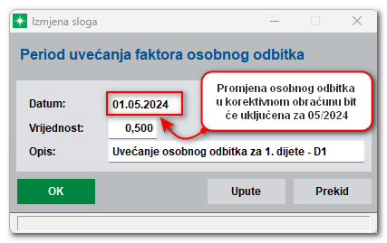 Promjena osobnih odbitaka tijekom godine Za radnike koji su tijekom godine imali promjenu faktora osobnog odbitka, trebalo je u periodima faktora osobnih odbitaka (kartica broj 4. Obitelj i odbici na samom radniku) upisati periode od kada se primjenjuje novi faktor osobnog odbitka. Radi točnog izračuna godišnjeg osobnog odbitka, kada je u pitanja promjena osobnog odbitka tijekom mjeseca, ako želite primijeniti osobni odbitak i za taj mjesec u godišnjem obračunu, tada u periodima osobnih odbitaka treba upisati da isti vrijedi od prvog dana u tom mjesecu (npr. 01.05.2024.). U protivnom ako ste napisali da osobni odbitak vrijedi od 15.05.2024., kod izračuna godišnjeg osobnog odbitka, program će navedenu promjenu primijeniti od 01.06.2024. godine.