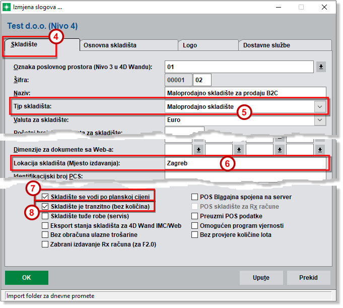 Na prvoj kartici „Skladište“ (4) za „Tip skladišta“ treba izabrati „Maloprodajno skladište“ (5).