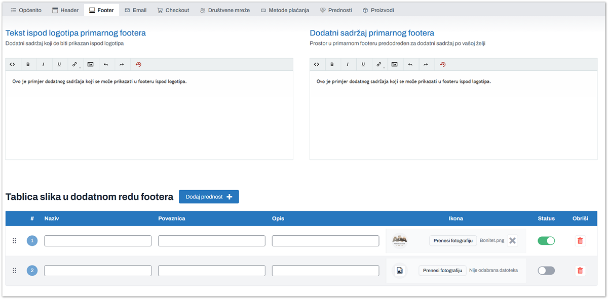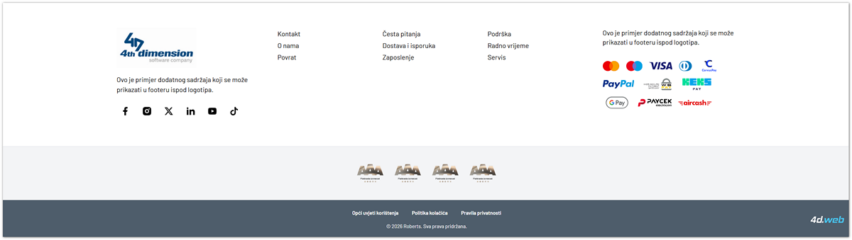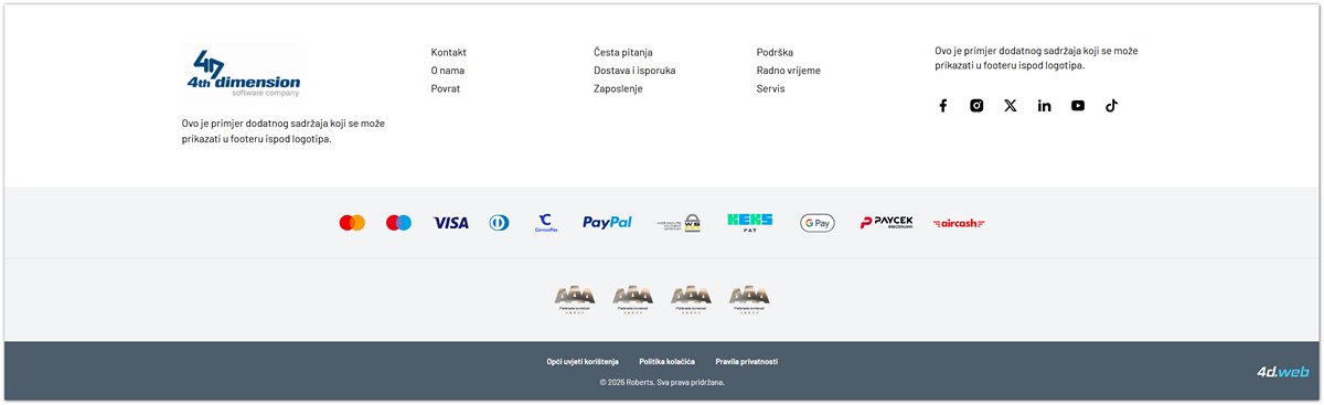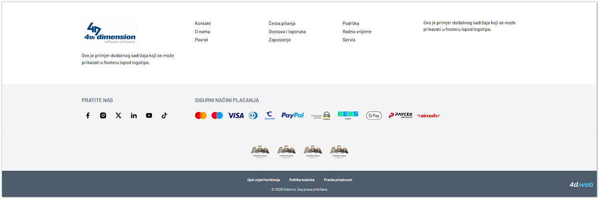 U tom dijelu su predviđena 3 stupca primarnog podnožje (Footer menu 1, 2, 3) te footer horizontalni izbornik za sekundarne poveznice, a stavke dodajete alatom „Dodaj stavke izbornika". Na taj način određujete koje će se statične stranice, informacije i važne poveznice prikazivati u stupcima podnožja, bez potrebe za intervencijom u dizajnu ili kodu. Sve ostale elemente koji čine podnožje vaše stranice možete prilagoditi u modulu 4D Web › Postavke : •logotip podnožja može biti drugačiji od onog u zaglavlju; •tekst ispod logotipa kratka poruka o vašem brendu ili dodatno pojašnjenje tko ste i što nudite; •profili na društvenim mrežama s pripadajućim ikonicama i poveznicama; •linkovi primarnog i sekundarnog podnožja statične stranice, pravni dokumenti i sl.; •ikonice metoda plaćanja koje kupcu vizualno potvrđuju sigurnost; •slobodan unos teksta putem WYSIWYG editora, npr. radno vrijeme, napomene, poruke; •prostor za dodatne sličice poput certifikata, nagradi, oznaka kvalitete i sl. koje pomažu u izgradnji povjerenja vašeg brenda Prikaz elemenata podnožja
