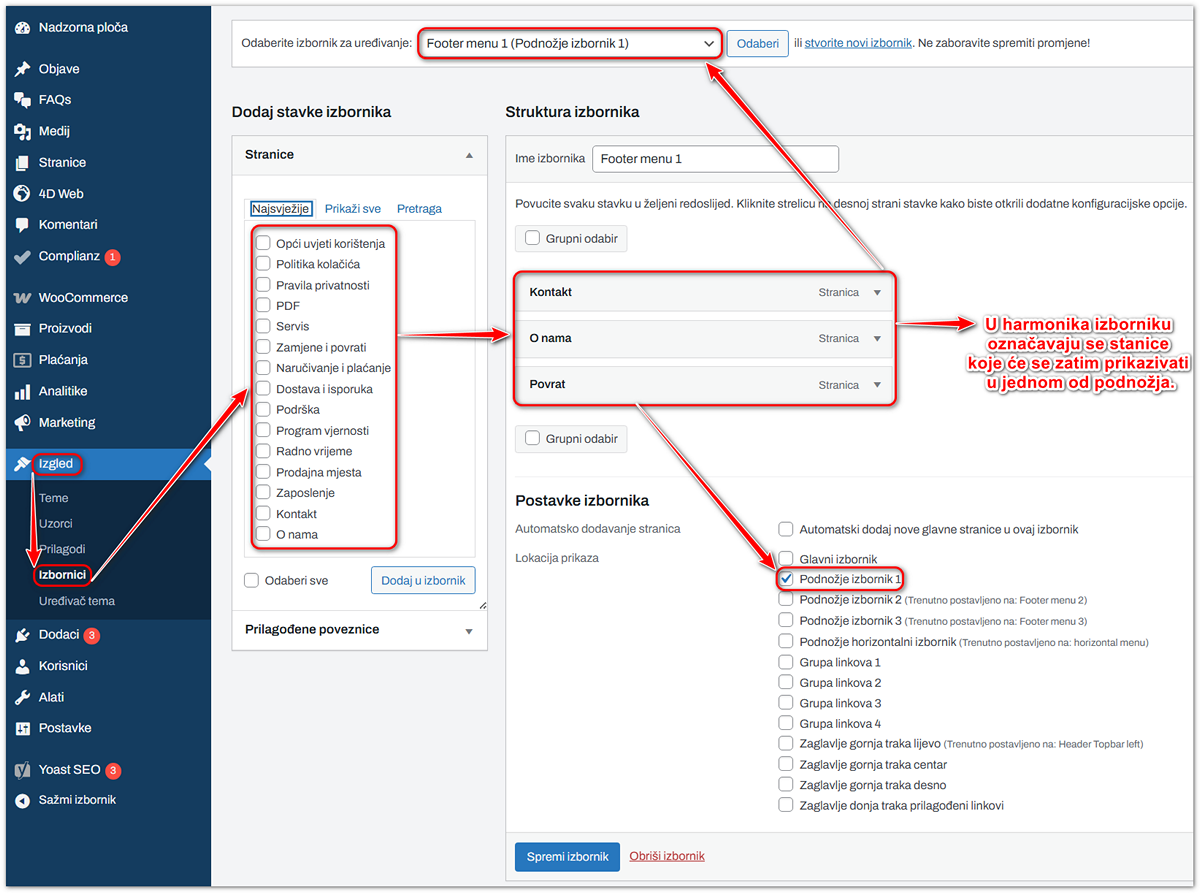 Što možete prilagoditi u podnožju? Postavke podnožja podijeljene su na dva mjesta u administratorskom sučelju, ovisno o tome što mijenjate. Sadržaj podnožja popunjavate putem: Izgled › Izbornici › Footer menu kao što je prikazano na sljedećoj slici: