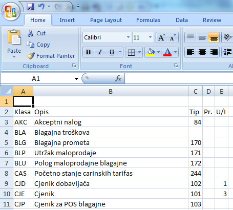 Kolone su odvojene točka-zarezom (;), završetak reda je kombinacija CR+LF. Treba paziti da se znaci (;) u originalnim podacima prije exporta zamijene nekim drugim znakom (npr.:,) zbog parsiranja i interpretacije *.csv formata jer takav sadržaj polja može značiti još jedan delimiter i uzrokovati neispravno importiranje podataka u drugi sustav. Šalju se sve kolone, a u kolone koje su nepoznate ili nisu potrebne upisuje se 0 ili ništa u ovisnosti od tipa podatka.