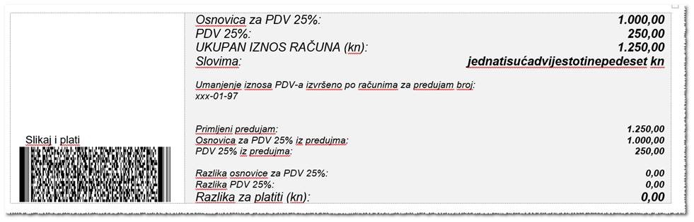 Nakon što ste izlaznu fakturu povezali sa stornom predujma, na ispisu iste će se pojaviti rekapitulacija: