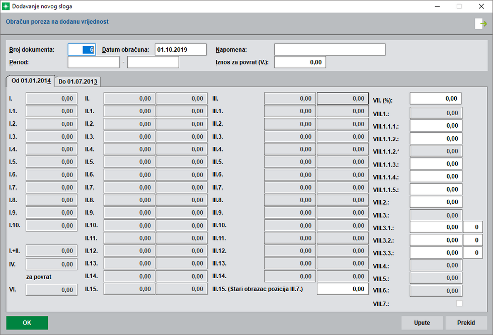 Obrade - Pozivom padajućeg izbornika nudi se sljedeći procesi: •Automatski izbor faktura - odabirom ove izborne linije proces automatski popunjava obračun PDV-a svim računima koji se trebaju naći u tom obračunskom razdoblju •Pregled i pojedinačni izbor uključenih faktura - Pozivom ove izborne linije otvara se forma s uključenim računima u obračun. Isti rezultat se postiže i odabirom tipke Računi na tabeli Obračuna poreza na dodanu vrijednost. •Preračun obračuna poreza – nekada je nakon puštanja procesa Automatski izbor faktura trebalo puštati proces Preračun obračuna poreza, međutim sada to više nije potrebno činiti jer program preračun bilo kakve izmjene u PDV-u odrađuje automatski •Oslobađanje faktura iz obračuna - pozivom ove izborne linije obračun će se isprazniti uz upozorenje i pitanje da li doista to želite uraditi Uplatnice - Pozivom izborne linije možete odabrati: •Nalog za plaćanje PDV obrasca (HUB) •Nalog za plaćanje PDV-K obrasca (HUB) •Pregled virmana Ispis - Pozivom padajućeg izbornika omogućava se ispis: •PDV obrazac •Obrazac PDV-S •Obrazac ZP •Obrazac PPO - od 01.2015. •Obrazac OPZ-STAT-1 •PDV-K obrazac (Kontrolni za 2015. godinu) •PDV -K obrazac za 2014. godinu •Rekapitulacija svih obračuna PDV-a - 1. dio •Rekapitulacija svih obračuna PDV-a - 2. dio •Rekapitulacija svih obračuna PDV-a - 3. dio •Obračun poreza •Kartica konta za obračun PDV-a •Zbirni izvještaj po PDV obračunu •Stari obrasci do 2005., 2009., 2012., 2013., 2014., 2015. Porezne knjige •Knjiga ulaznih (primljenih )računa •Evidencija prenosa porezne obaveze u tuzemstvu •Evidencija o stjecanjima dobara unutar EU •Evidencija o primljenim uslugama iz EU •Evidencija o primljenim isporukama dob. i usl. od por. obveznika bez sjed. u RH •Evidencija o uvozu •Porezna knjiga PDV-MU •Rekapitulacija poreznih knjiga U-RA •Knjiga izlaznih računa •Evidencija naknadnog oslobađanja •Porezna knjiga PDV-MI •Pregled izlaznih računa u okviru trostranog posla koji se uključuju samo u ZP obrazac •Rekapitulacija poreznih knjiga I-RA •Porezne knjige do 12.2009., 02.2012., 01.2013., 07.2013.,01.2014. Proširene porezne knjige •Knjiga ulaznih (primljenih) računa - u dva reda •Evidencija prenosa porezne obaveze u tuzemstvu - u dva reda •Evidencija o stjecanjima dobara unutar EU - u dva reda •Evidencija o primljenim uslugama iz EU - u dva reda •Evidencija o primljenim isporukama dob. i usl. od por. obveznika bez sjed. u RH -u dva reda •Evidencija o uvozu - u dva reda •Rekapitulacija poreznih knjiga U-RA - u dva reda •Knjiga izlaznih računa - u dva reda •Evidencija naknadnog oslobađanja - u dva reda •Rekapitulacija poreznih knjiga I-RA - u dva reda •Proširene porezne knjige do 01.2014. Pregled likvidature •Knjiga ulaznih (primljenih) računa •Evidencija prenosa porezne obaveze u tuzemstvu •Evidencija o stjecanjima dobara unutar EU •Evidencija o primljenim uslugama iz EU •Evidencija o primljenim isporukama dob. i usl. od por. obveznika bez sjed. u RH •Evidencija o uvozu •Porezna knjiga PDV-MU •Rekapitulacija poreznih knjiga U-RA •Knjiga izlaznih računa •Evidencija naknadnog oslobađanja •Porezna knjiga PDV-MI •Rekapitulacija poreznih knjiga I-RA Exporti •Export PDV obrasca za e-Poreznu •Export PDV-S obrasca za e-Poreznu •Export ZP obrasca za e-Poreznu •Export PPO obrasca za e-Poreznu od 01.2015 •Export U-RA obrasca za e-Poreznu •Export PDV-K za e-Poreznu •Stari obrasci od 07.2009 - 01.2015. Tipke za ažuriranje tabele dokumenata Unos, Izmjena, Brisanje nalaze se u donjem dijelu ove tabele. Pritiskom na tipku Unos program otvara formu dokumenta. Forma dokumenata Forma dokumenta se sastoji od sljedećih polja koja trebate popuniti: Kada je forma dokumenta popunjena, pritiskom na tipku Ok uneseni podaci se prihvaćaju i prepisuju u tabelu dokumenata.