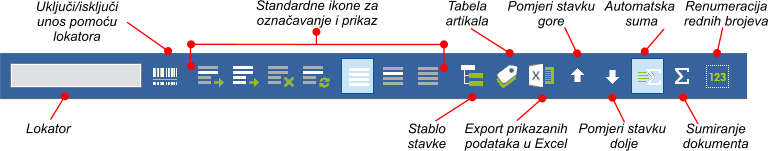 Za rad s dokumentom Povrat reversa (REU) potrebno je startati modul Veleprodaja ili Maloprodaja te u padajućem izborniku Promet odabrati izbornu liniju Povrat reversa. Njenim odabirom otvorit će se tabela dokumenata s nazivom Povrat reversa (REU). Tabela dokumenata Prije početka rada u tabeli dokumenata pročitajte opće upute o tabelama kao i o tabelama dokumenata. Alatna traka Na alatnoj traci nalaze se ikone koje se najčešće koriste i time osiguravaju brz pristup traženoj informaciji ili željenoj operaciji. Pored lokatora, polja koje služi za brzo pronalaženje sloga u bazi podataka, nalazi se standardne ikone za označavanje i prikaz označenih slogova.