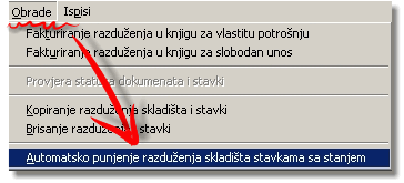 Proces se poziva sa tabele dokumenata Razduženje skladišta (RAS) iz padajućeg izbornika Obrade --> Automatsko punjenje razduženja skladišta svim stavkama na stanju (vidi sliku). Pojaviti će se poruka koja će vas upozoriti da ste pozvali navedebi proces, kao i upozorenje o mogućnosti dužine trajanja procesa. Klikom na Ok razduženje skladišta će se popuniti svom robom sa stanja odabranog skladišta.
