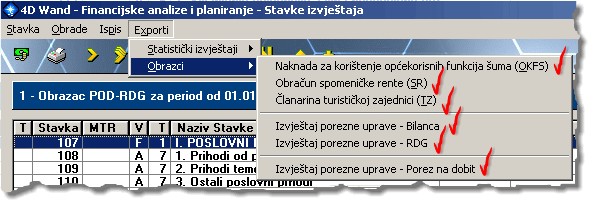 Export izvještaja u Excel obrasce Proces exporta izvještaja se vrši iz stavki izvještaja, pozivanjem padajućeg izbornika Exporti a Obrazci, te odabir u koji obrazac želite exportirati podat-ke.