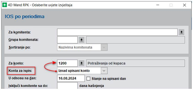 Kada ste to odradili izvještaj radi u ovisnosti o parametru Konta za ispis (označeno crvenom bojom niže na slici). Ako je odabran parametar Iznad upisani konto tada izvještaj radi samo po jednom kontu i to onom koji je upisan u gornjem polju, odnosno kao što je i do sada radio izvještaj:
