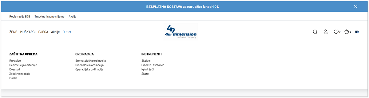 5 VARIJANTI ZAGLAVLJA (HEADER), 3 VARIJANTE PODNOŽJA (FOOTER) I TU NIJE KRAJ! Svaka web trgovina ima dva elementa koja posjetitelj primijeti odmah pri dolasku: zaglavlje i podnožje. Upravo ta dva elementa nose vaš vizualni identitet, olakšavaju navigaciju i oslikavaju prvi dojam. U 4D Web Shopu ta dva elementa možete potpuno prilagoditi (izgled, boje, sadržaj i logotip) putem dodatka 4D Web -> Izgled . Zaglavlje (header) 4D Web Shop trenutno nudi 5 varijanti zaglavlja razvijenih kako bi odgovorile na stvarne potrebe naših korisnika, od onih s opsežnim kategorijama proizvoda do onih koji preferiraju čist i elegantan pristup. Kratki pregled varijanti: Zaglavlje 1 - klasičan i provjereni izgled, dobar polazišni odabir za većinu trgovina