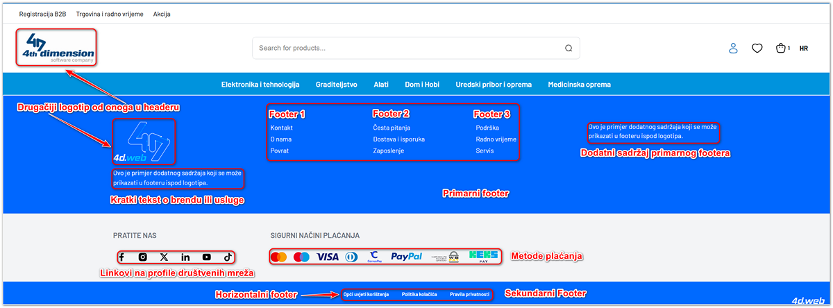 U tom dijelu su predviđena 3 stupca primarnog podnožje (Footer menu 1, 2, 3) te footer horizontalni izbornik za sekundarne poveznice, a stavke dodajete alatom „Dodaj stavke izbornika". Na taj način određujete koje će se statične stranice, informacije i važne poveznice prikazivati u stupcima podnožja, bez potrebe za intervencijom u dizajnu ili kodu. Sve ostale elemente koji čine podnožje vaše stranice možete prilagoditi u modulu 4D Web › Postavke : •logotip podnožja može biti drugačiji od onog u zaglavlju; •tekst ispod logotipa kratka poruka o vašem brendu ili dodatno pojašnjenje tko ste i što nudite; •profili na društvenim mrežama s pripadajućim ikonicama i poveznicama; •linkovi primarnog i sekundarnog podnožja statične stranice, pravni dokumenti i sl.; •ikonice metoda plaćanja koje kupcu vizualno potvrđuju sigurnost; •slobodan unos teksta putem WYSIWYG editora, npr. radno vrijeme, napomene, poruke; •prostor za dodatne sličice poput certifikata, nagradi, oznaka kvalitete i sl. koje pomažu u izgradnji povjerenja vašeg brenda Prikaz elemenata podnožja